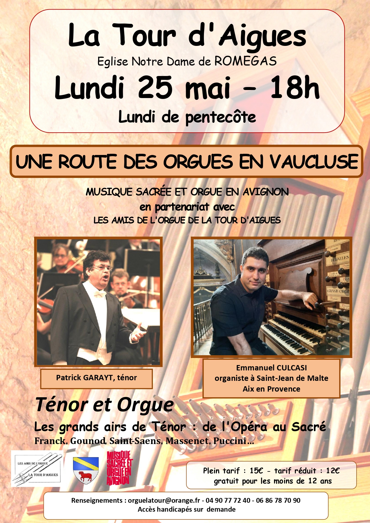 Le lundi 25 mai (lundi de Pentecôte) , les Amis de l’Orgue de La Tour d’Aigues accueilleront le festival « Une Route des Orgues en Vaucluse » pour un concert « Ténor et Orgue : de l’Opéra au Sacré ». Le ténor Patrick GARAYT et l’organiste Emmanuel CULCASI (organiste à Saint-Jean de Malte – Aix-en-Provence) interprèteront des œuvres de César Franck, Gounod, Saint-Saens, Massenet, Puccini….