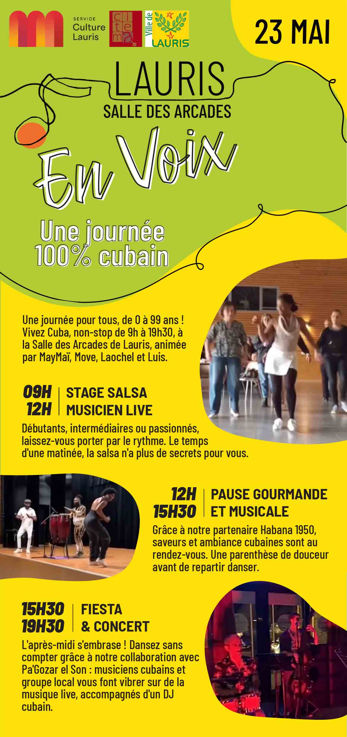 Vivez une journée 100 % cubaine avec En Voix. Stage salsa, musique live, pause gourmande, fiesta et concert rythment ce rendez-vous festif ouvert à tous à la Salle des Arcades. Une immersion conviviale aux couleurs de Cuba.