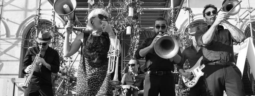 Six artistes : une chanteuse méga-faune, un bassiste à voix électrisant, un tuba haut en chœurs, un sax très appeal, un trombone à complice et un batteur électrique.