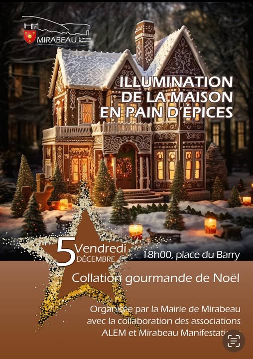 Comme chaque année retrouvons nous sur la place du village avec les enfants pour les illuminations de Noël sur le thème de la maison en pain d’épice.