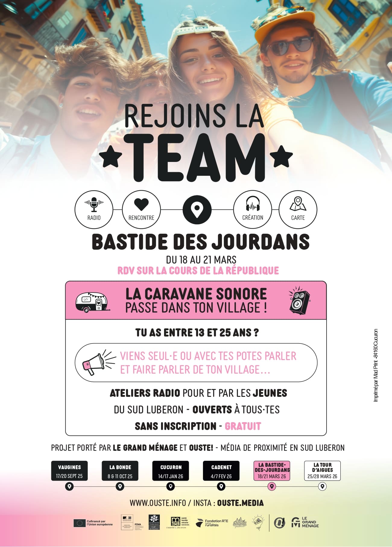 La Caravane Sonore est un dispositif de plateau radio itinérant qui sillonne les villages du Sud Luberon et invite des groupes de jeunes entre 13 et 30 ans à parler de leur village en s’emparant du matériel radio et d’enregistrement.
