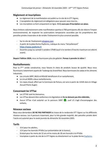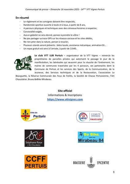 ● Le règlement de la manifestation est publié sur le site de la VTT Vignes,