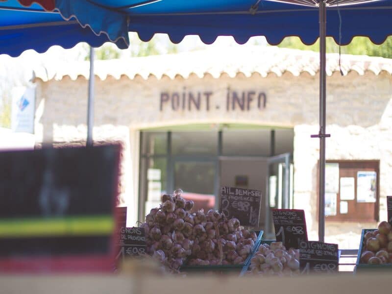 Marché paysan du dimanche matin sur la Place du Village, de mai à octobre.
