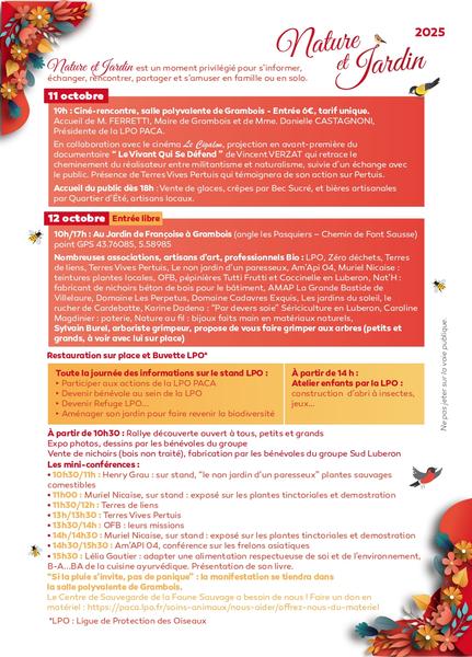 Après la soirée ciné-débat du 11 octobre, la journée du 12 octobre sera NATURE dans le Jardin de Françoise à Grambois !