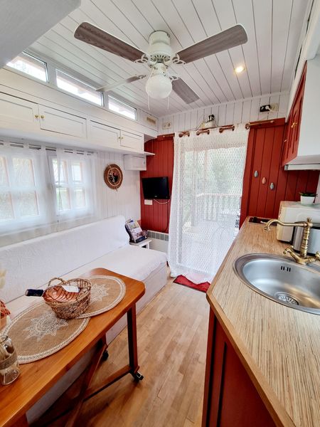 Cette roulotte de style unique (avec hublots style « orient express ») allie harmonieusement charme, originalité, et liberté au confort le plus exigeant.